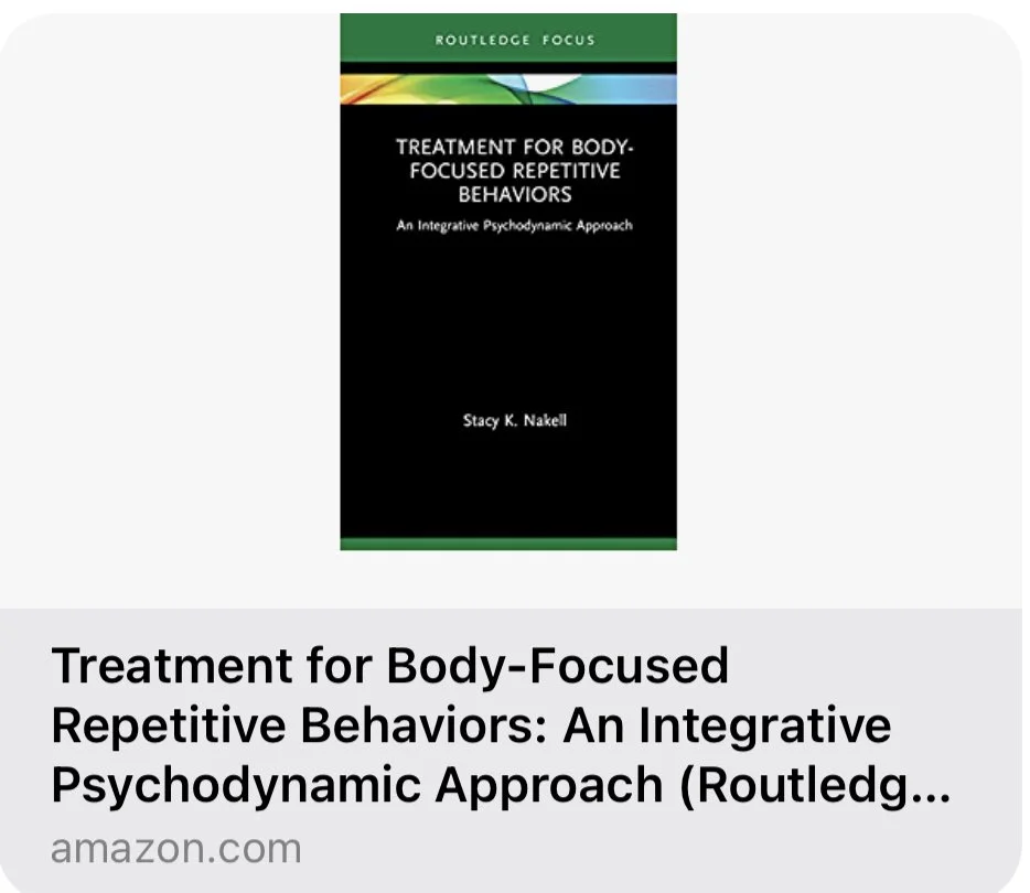 In 2023, I published a book, Treatment for Body-Focused Repetitive Behaviors: An Integrative Psychodynamic Approach as part of the Routledge Focus on Mental Health Series. You can find the book here: AmazonPurchase