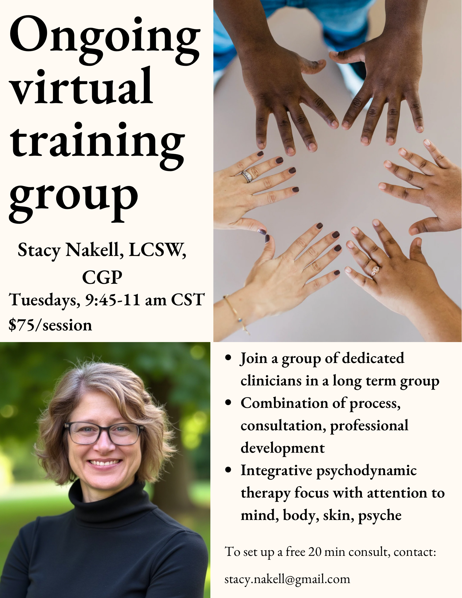 Sep 2 9:45 AM09:45 Ongoing training group Tuesday, September 2, 2025 9:45 AM 11:00 AM 09:45 11:00 Stacy Nakell, LCSW, CGP (map) Google Calendar ICS View Event →